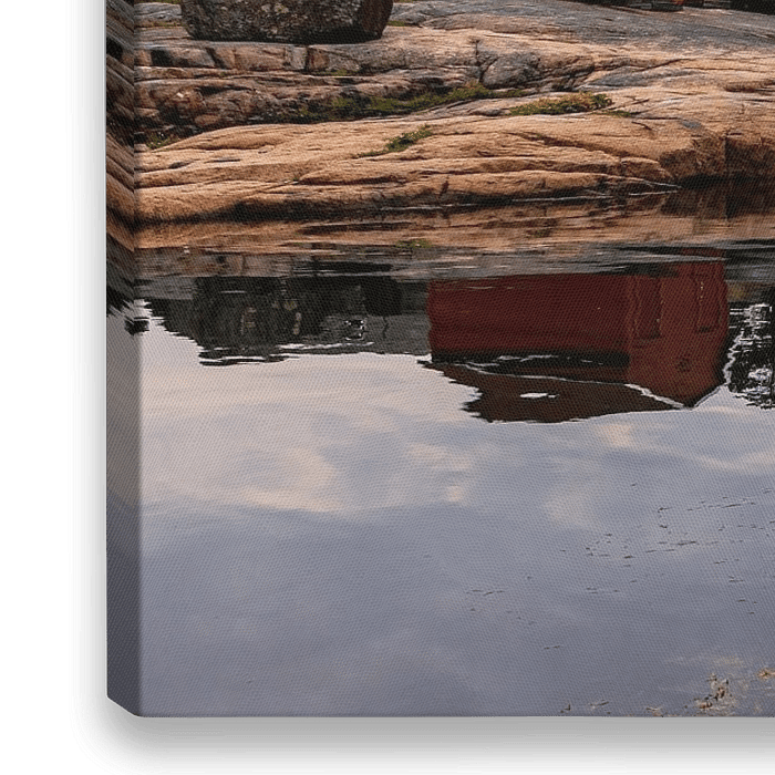 Langs de zuidkust van Noorwegen liggen veel dorpen met kleurrijke huizen, en ook veel vakantiewoningen en boothuizen. De meest voorkomende kleuren zijn rood, okergeel en wit. Dit geeft een hele vrolijke sfeer aan deze kustplaatsen. Hier zien we een klein eilandje met daarop een botenhuis in de namiddag zon.