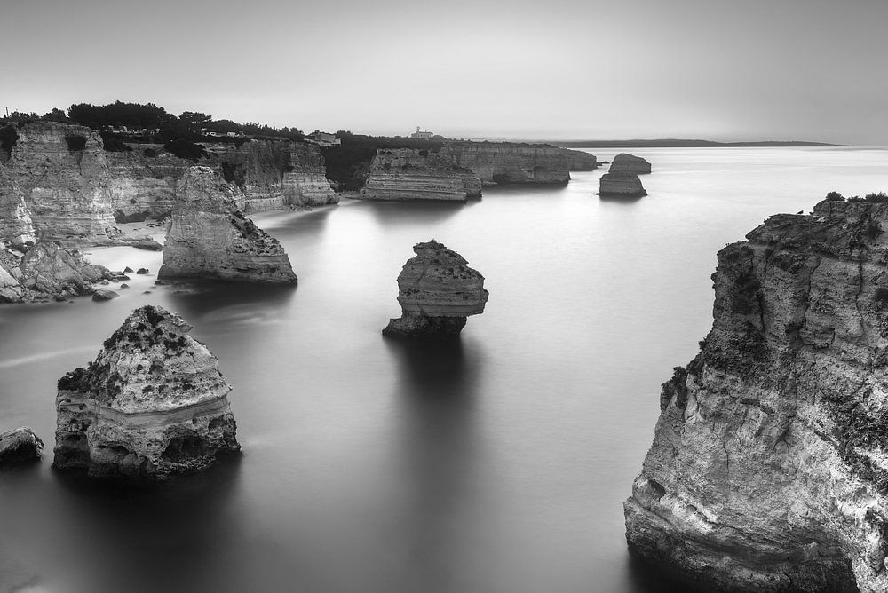 Kustlandschap met kliffen, rotspoort en grote monolieten van rots en steen in de zachte zonsopgang.