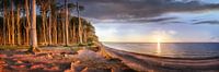 Oostzee met natuurlijk strand in Noord-Duitsland bij zonsondergang. Sprookjesbos aan een steile kust met een strand ervoor aan de Oostzeekust van Mecklenburg Vorpommern bij Kühlungsborn en Nienhagen. De wortels van de bomen schijnen plastisch met prachtige schaduwen in het diepe zonlicht.