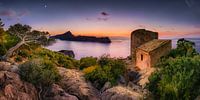 Landschapsbidl van het ongerepte kustlandschap van Mallorca. Om de Torre de Cala en Basset aan de zuidwestkust van Mallorca bij Andratx te zien. De wandeling naar de Torre de Cala en Basset is een heel avontuur. Maar de weg is de moeite waard: een prachtig uitzicht en toch een duidelijke insidertip voor wandelaars. De foto is genomen in het avondlicht ongeveer 30 minuten na zonsondergang.