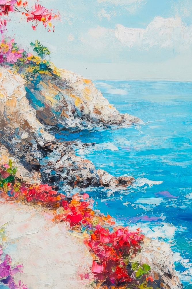 Levendige bougainville in felroze en rood omlijst een schilderachtig kustpad dat zachtjes naar het glinsterende azuurblauwe water leidt. Een eenzame zeilboot glijdt door de stralende zee, terwijl witte wolken elegant ronddartelen in de lucht. Dit harmonieuze tafereel straalt rust en zorgeloze zomernostalgie uit.