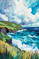 Levendige kleuren dansen over het doek en voegen een speelse lichtheid toe aan de scène aan zee. De dynamische golven die tegen de groene klif slaan creëren een verfrissende sfeer, perfect voor een woonkamer waar ze de zintuigen kunnen prikkelen en dromen van reizen aan zee.