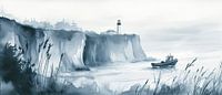 In een zacht spel van blauwe en grijze tinten creëert het kustlandschap met de majestueuze vuurtoren en de kalme boot een vredige, melancholische sfeer. De zachte golven en ruige kustlijn nodigen je uit om te dromen. Perfect voor de woonkamer, het brengt een gevoel van rust en maritieme frisheid in elke kamer.
