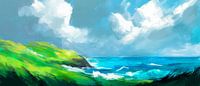 Zachte groene tinten vermengen zich harmonieus met het diepe blauw van de zee, terwijl majestueuze wolken boven het tafereel zweven. Dit levendige landschap straalt rust en frisheid uit en is perfect voor de woonkamer om een ontspannen sfeer te creëren en de geest tot rust te brengen. Ideaal voor natuurliefhebbers en dromerige geesten.