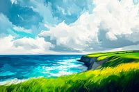 Een lichtgevend samenspel van zachte groene tinten en stralend blauw ontvouwt zich in dit levendige landschap. De dynamische wolken dansen in de lucht boven het glinsterende water, terwijl het zachte geluid van de golven rust en vrijheid uitstraalt. Ideaal voor een woonkamer om een ontspannen en harmonieuze sfeer te creëren.