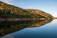 Dit kustlandschap krijgt een warme kleur met de gloed van de zonsopkomst. Het water is rimpelloos in deze wildernis van Noorwegen.