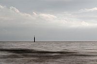 Rustige strandshot van de Oostzeekust met een prominente golfstructuur en een signaalmast op de achtergrond, het wateroppervlak wordt gladgestreken door langdurige blootstelling, wolkenstructuren
