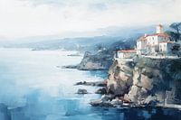 Kustlijn | Kustlijn Schilderij - Het schilderij toont een pittoreske kustlijn met een klassiek wit gebouw, vermoedelijk een vuurtoren of een kapel, gelegen op een steile klif. De impressionistische schilderstijl gebruikt losse penseelstreken, wat een levendige textuur geeft aan de rotsen en het water. Blauw- en grijstinten domineren het palet, maar zijn gecomplementeerd door het warme wit van de gebouwen en de subtiele bruinen van de rotsen, die diepte en contrast verlenen.
