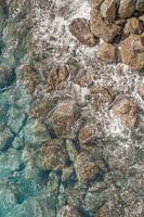 Op deze foto is een ruige kustlijn te zien met rotsen en kristal helder zeewater. Deze foto is gemaakt in het stadje Amalfi aan de gelijknamige Amalfi kust in Italië.