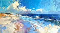 Met een breed scala aan blauwtinten die de diepte en kracht van de oceaan symboliseren, contrasteren met de zachte pastelkleuren en witte kleuren die de schuimkoppen en het zand van het strand…