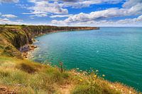 Prachtige opname van de kustlijn van Pointe du Hoc in Normandië, Frankrijk, tussen de stranden Omaha Beach en Utah Beach in, waar tijdens WW2 de D-day invasie plaatsvond, op een mooie zomerse dag