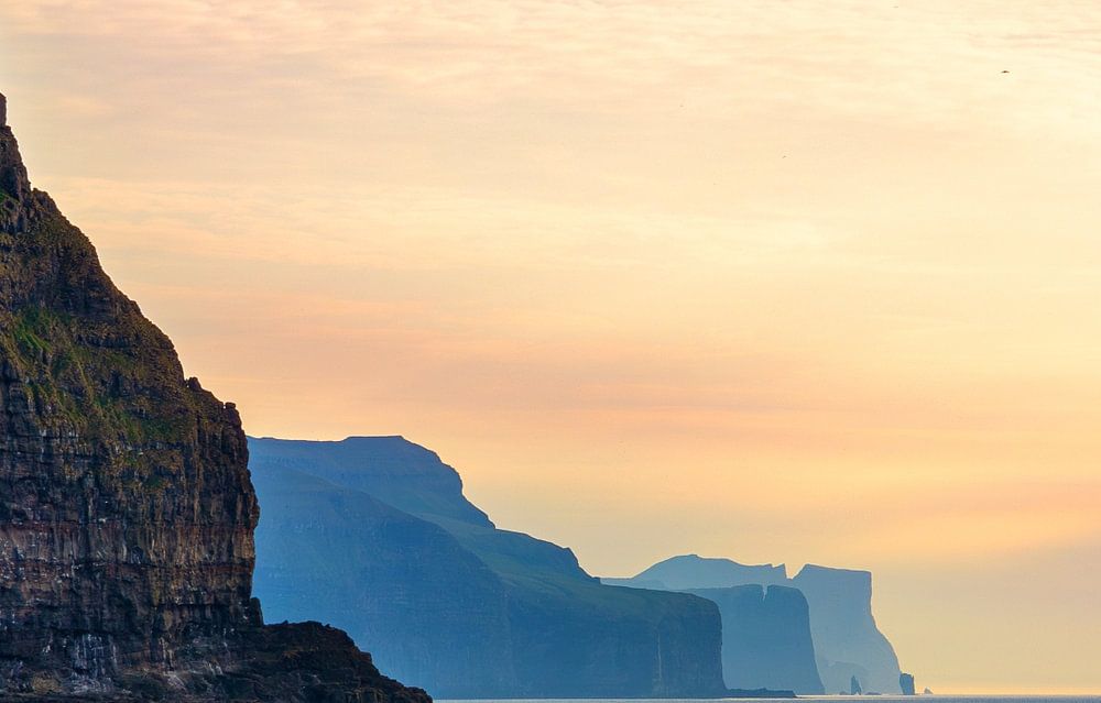 De Faeröer eilanden is een dunbevolkte kleine groep van 18 eilanden midden in de Atlantische Oceaan. Ze liggen tussen IJsland, Schotland en Noorwegen in en zijn verbonden aan Denemarken. Het landschap is groen en bergachtig maar er komen nauwelijks bomen voor. De vele baaien, dorpen en berghellingen zorgen voor prachtige uitkijkpunten en vergezichten. Hier zien we de noordkust van de eilanden tijdens de zonsondergang. In de verte staan de twee zeerotsen Risin en Kellingin.