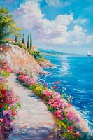 Een schilderachtig kustpad vol bloeiende planten slingert zachtjes langs de glinsterende zee. Te midden van helderblauwe golven en zachte wolken lijkt het landschap een droom van kleur. De warme zonnestralen dansen op het water, terwijl een zeilboot in de verte een vleugje avontuur toevoegt. Een paradijs voor de ziel!