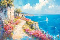Een schilderachtig pad slingert langs een steile klif, omringd door heldere bloemen in warme kleuren. De horizon versmelt met de helderblauwe zee, terwijl een zeilboot zachtjes over de golven glijdt. De wolken dansen in de lucht en geven het landschap een gevoel van vrijheid en eindeloze uitgestrektheid.