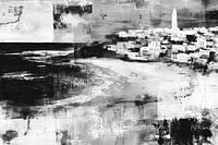 Een gestructureerd, abstract landschap van een kustdorp met een opvallende vuurtoren. Het werk maakt gebruik van een collage-achtige esthetiek met gelaagde grijstinten, scherpe zwarte zee-elementen en witte architecturale vormen.