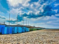 Een rustig uitzicht op het strand van Viareggio's, met iconische structuren aan zee en levendige strandcabines, onder een dramatische hemel. De zachte pasteltinten van de scène weerspiegelen de ontspannen charme van Versilia's kustlijn.