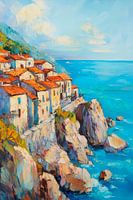 De charmante huizen aan de steile kust glanzen in zachte pastelkleuren, waarbij de rode daken een levendig contrast vormen met de helderblauwe zee. De rotsachtige kustlijn en het sprankelende water creëren een idyllische omgeving die de zintuigen prikkelt en uitnodigt om te dromen. Een harmonieuze combinatie van natuur en architectuur.