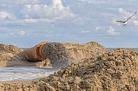 Foto van het opspuiten van zand op het strand om de Hollandse kust te versterken.