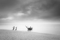Atmosferische opname van twee vissers die hun boot aan wal trekken om uit te varen. Baabe, eiland Rügen.