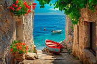 In een pittoresk steegje, omringd door bloeiende rode geraniums, opent het uitzicht zich naar het glinsterende blauwe water. Een charmant rood bootje dobbert zachtjes in de verte, terwijl de stenen muren verhalen van vervlogen tijden fluisteren. De tijd lijkt hier stil te staan, omringd door de idyllische rust van de zee en de natuur.