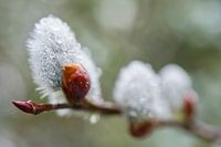 Wilgentak met regendruppels Macrofoto - De wilg is helder wit en de waterdruppels voegen iets toe aan de zachtheid van de bloemknop. De achtergrond achter het wilgenbosje is medium olijfgroen. De tak is diep roodbruin.