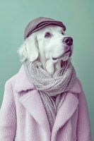 Elegantie in bont, gecombineerd met een vleugje retro charme: een Kuvasz in een stijlvolle outfit, met een chique muts en een knusse sjaal, straalt gracieuze sereniteit uit. De zachte, wit-gouden kleuren van zijn bont harmoniëren perfect met de zachte, pastelgroene achtergrond, terwijl de uitdrukking in zijn ogen trots en intelligentie verraadt.