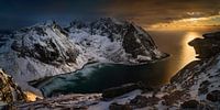 Kvalvika kustlijn panorama van Ryten top in de winter zonsondergang, Lofoten