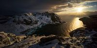 Kvalvika kustlijn panorama van Ryten top in de winter zonsondergang, Lofoten