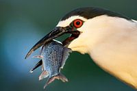 Portret van een Kwak (Nycticorax nycticorax) met grote vis in zijn snavel.