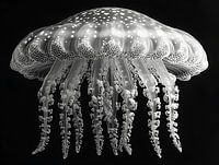 In deze zwart-wit afbeelding zweeft een kwal sierlijk door de donkere oceaan. Haar transparante lichaam licht zacht op tegen de diepzwarte achtergrond, terwijl haar lange, dunne tentakels als zijde door het water bewegen. Het beeld ademt kwetsbaarheid en mysterie — een gewichtloos wezen dansend in stilte, omgeven door tijdloze duisternis.