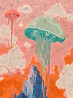 Twee grote kwallen zweven boven een surrealistisch landschap, waar roze wolken en oranje tinten samenkomen. De zachte vormen en dromerige kleuren creëren een bijna buitenaardse sfeer, waarin de kwallen als zwevende wezens door de lucht bewegen. De speelse combinatie van waterachtige dieren in een luchtlandschap maakt dit werk zowel mysterieus als fantasierijk.
