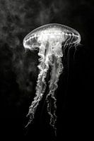 De meditatieve kwal zweeft majestueus door de kamer in mysterieus zwart-wit. Zijn filigraan tentakels stromen zachtjes terwijl het licht delicaat wordt gereflecteerd. Dit kunstwerk geeft een woonkamer een kalme, contemplatieve sfeer en trekt alle blikken naar zich toe, ideaal voor ontspannende momenten en geïnspireerde gesprekken.
