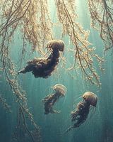 ​Laat u meevoeren door dit exclusieve kunstwerk waarin de delicate dans van kwallen en bloemen samensmelt tot een serene…