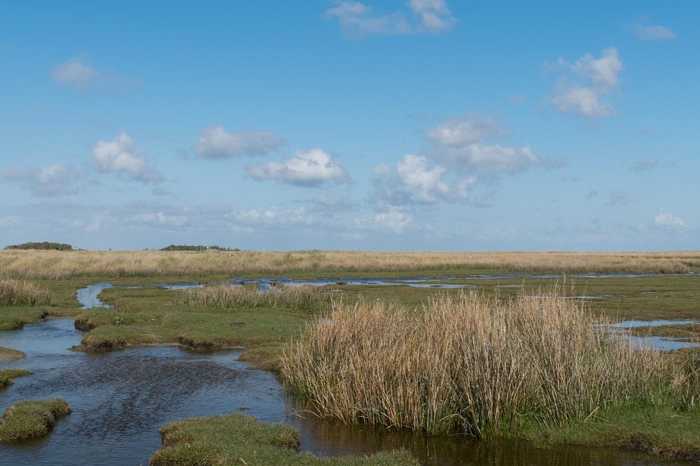 De mooie natuur op het Waddeneiland Schiermonnikoog op een mooie zonnige dag. Blauwe lucht met kleine schapenwolkjes met een mooie weerspiegeling in het ven.