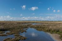 De mooie natuur op het Waddeneiland Schiermonnikoog op een mooie zonnige dag. Blauwe lucht met kleine schapenwolkjes met een mooie weerspiegeling in het ven.
