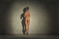 De keuze voor grauwe en fletse kleuren in de muur creëert een contrast met de warme huidtonen van de jonge vrouw, waardoor haar kwetsbaarheid nog meer benadrukt wordt. Het spel van licht en schaduw werpt een zachte gloed over haar lichaam en legt de nadruk op haar fragiliteit.