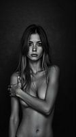 Dit intieme portret toont een vrouw die frontaal in beeld verschijnt, haar lichaam deels omsloten door haar arm. De blik in haar ogen is open en intens, maar tegelijk ook ondoorgrondelijk. Er zit een spanning in dit beeld: kracht en kwetsbaarheid vloeien samen in één moment van pure aanwezigheid. De donkere achtergrond en het sterke…