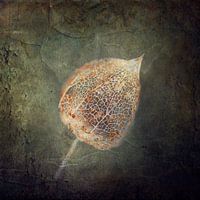 Een enkele verwelkte lampionbloem (Physalis alkenegi) met filigraanachtige nerven rust tegen een gestructureerde achtergrond. De vervaagde kleuren contrasteren met de aardetinten en creëren een rustige sfeer.