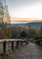 Portret op het natuurdomein Kwintelooijen in Rhenen, provincie Utrecht, met zicht op de grote trap, met op de achtergrond bomen met prachtige herfstkleuren, de nevel die over het landschap hangt, en de zon die bijna opkomt.