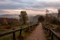Landschap op natuurgebied Kwintelooijen in Rhenen, provincie Utrecht, met zicht op de grote trap. De zon komt op door het mooie wolkendek, de mist hangt in flarden over de grond en de bomen vertonen prachtige herfstkleuren.