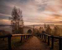 Landschap op natuurgebied Kwintelooijen in Rhenen, provincie Utrecht, met zicht op de grote trap. De zon komt op door het mooie wolkendek, de mist hangt in flarden over de grond en de bomen vertonen prachtige herfstkleuren.