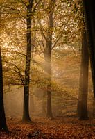 Landschap op natuurgebied Kwintelooijen in Rhenen, provincie Utrecht. De zonnestralen schijnen door het mistige herfstbos, wat voor prachtige zonneharpen zorgt.