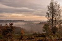 Landschap op natuurgebied Kwintelooijen in Rhenen, provincie Utrecht. De zon komt op door het mooie wolkendek, de mist hangt in flarden over de grond en de bomen vertonen prachtige herfstkleuren.