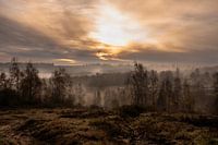 Landschap op natuurgebied Kwintelooijen in Rhenen, provincie Utrecht. De zon komt op door het mooie wolkendek, de mist hangt in flarden over de grond en de bomen vertonen prachtige herfstkleuren.
