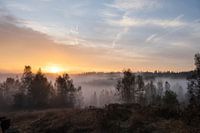 Landschap bij natuurgebied Kwintelooijen in Rhenen, provincie Utrecht. De zon komt op over de mistige heuvels.