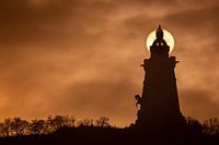 De zon schijnt door de mist achter het Kyffhäuser Monument in Thüringen