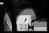 De foto toont het dramatische samenspel van licht, staal en schaduw van het station. De strakke lijnen van de skybridge voor voetgangers, het industriële rasterwerk van het dak en de surrealistische trap naar nergens roepen een futuristische en minimale sfeer op.