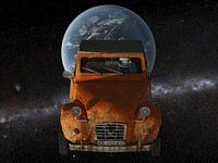 Een artist impression gemaakt naar aanleiding van de succesvolle lancering van de eerste Falcon Heavy-raket door SpaceX. Elon Musk stuurde zijn Tesla Roadster mee omhoog als testvracht maar met een roestige oude Eend kan het natuurlijk ook. Starman achterna met een stokbrood, lekkere Franse kaasjes en een fles wijn. Du pain, du vin, du…