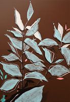 Een pop-art portret van blauwe, witte en roze bladeren. Blauwe fantasiebladeren op een warme bruine achtergrond.