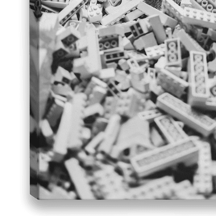 Vintage zwart/wit foto van een enorm GROTE en angstaanjagende Godzilla in een enorme GROTE stapel van LEGO blokjes.